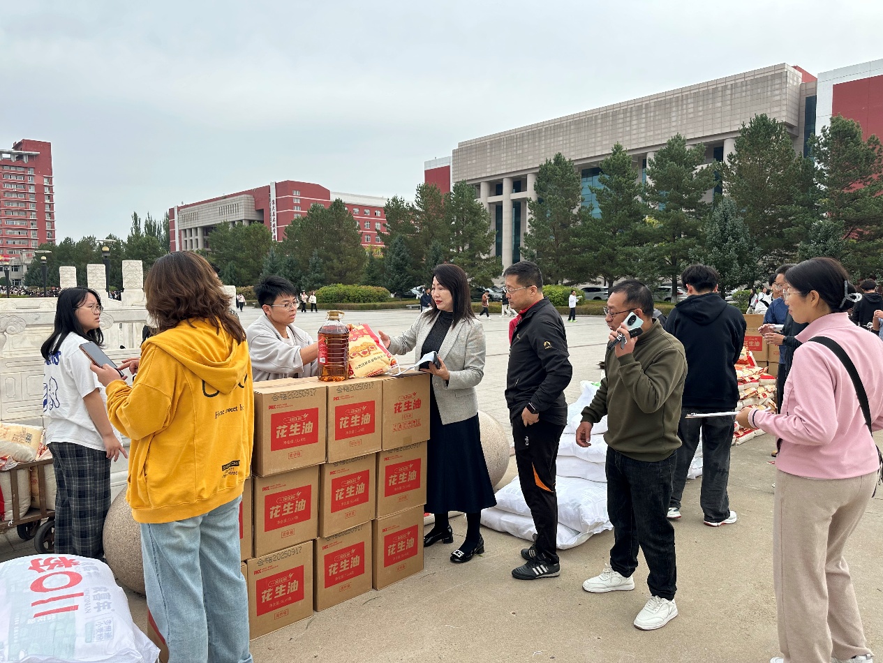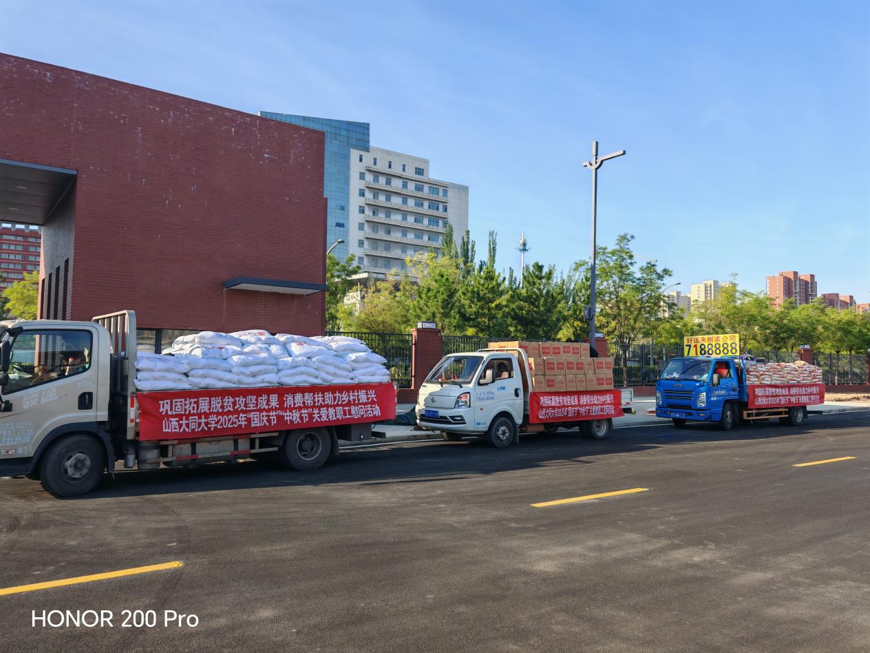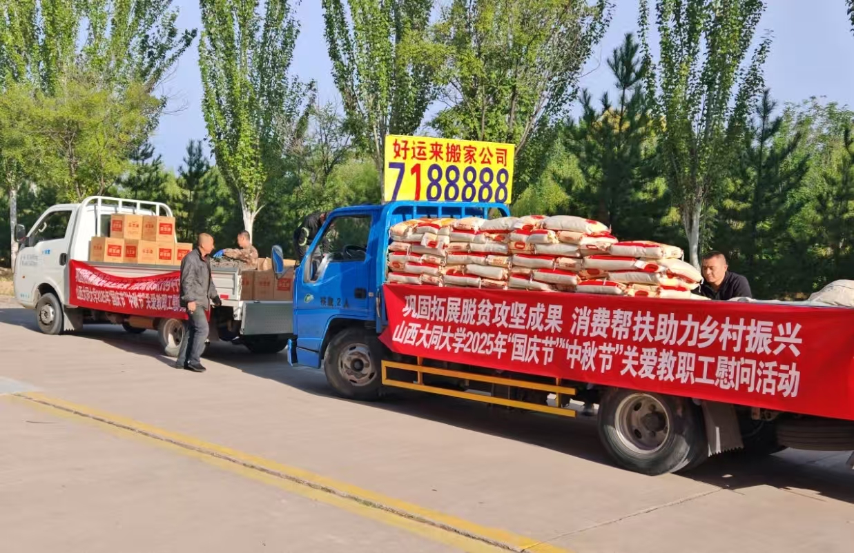 校园内,满载爱心物资的车辆上,‘巩固拓展脱贫攻坚成果 消费帮扶助力乡村振兴 山西大同大学2025年“国庆节”“中秋节”关爱教职工慰问活动”’的红色横幅格外醒目,生动体现了学校将“关爱教职工”与“助力乡村振兴”深度融合的发展理念。