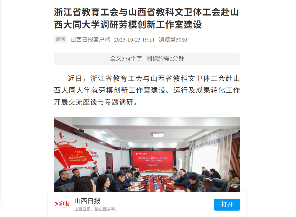 此次浙晋工会联合调研,不仅加强了两省教育工会与高校的工作联系,更为双方分享劳模创新工作室建设经验、探索新形势下工会工作新思路提供了宝贵平台,将对激发教职工创新创造活力、助推高校教育事业高质量发展产生积极深远影响。