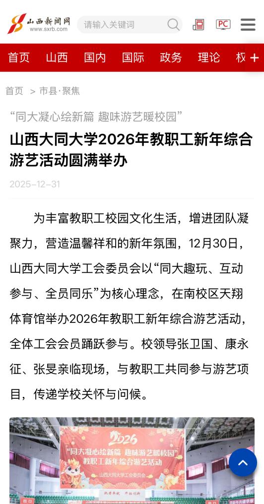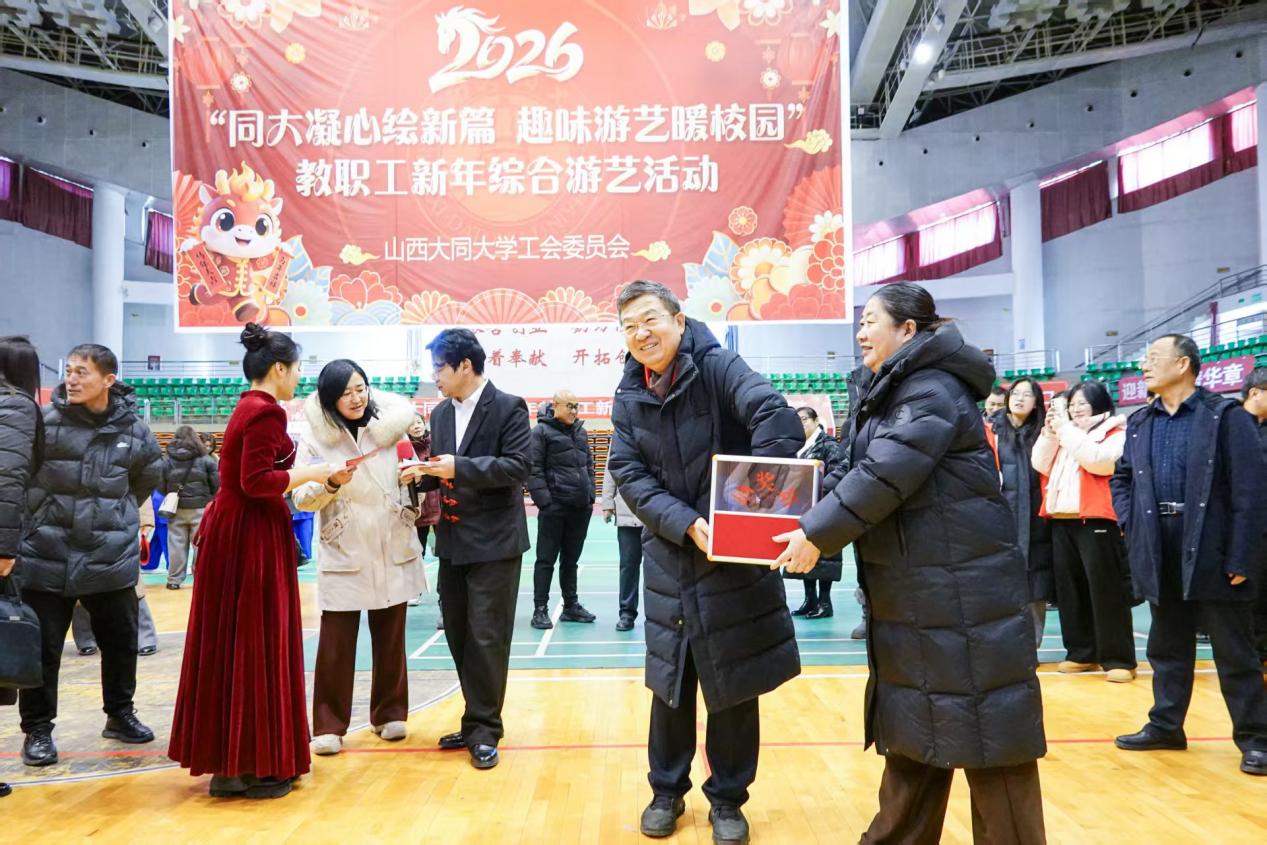 为丰富教职工校园文化生活,增进团队凝聚力,营造温馨祥和的新年氛围,12月30日,山西大同大学工会委员会以“同大趣玩、互动参与、全员同乐”为核心理念,在南校区天翔体育馆举办2026年教职工新年综合游艺活动,全体工会会员踊跃参与。校领导张卫国、康永征、张旻亲临现场,与教职工共同参与游艺项目,传递学校关怀与问候。