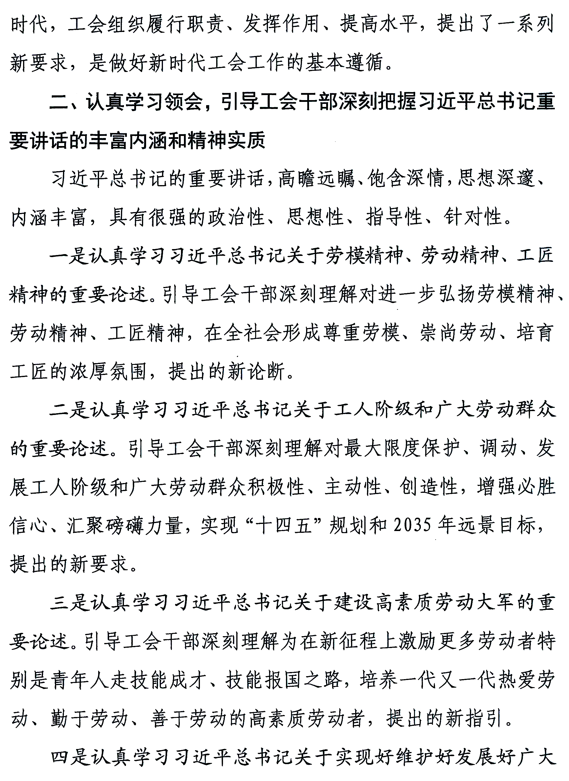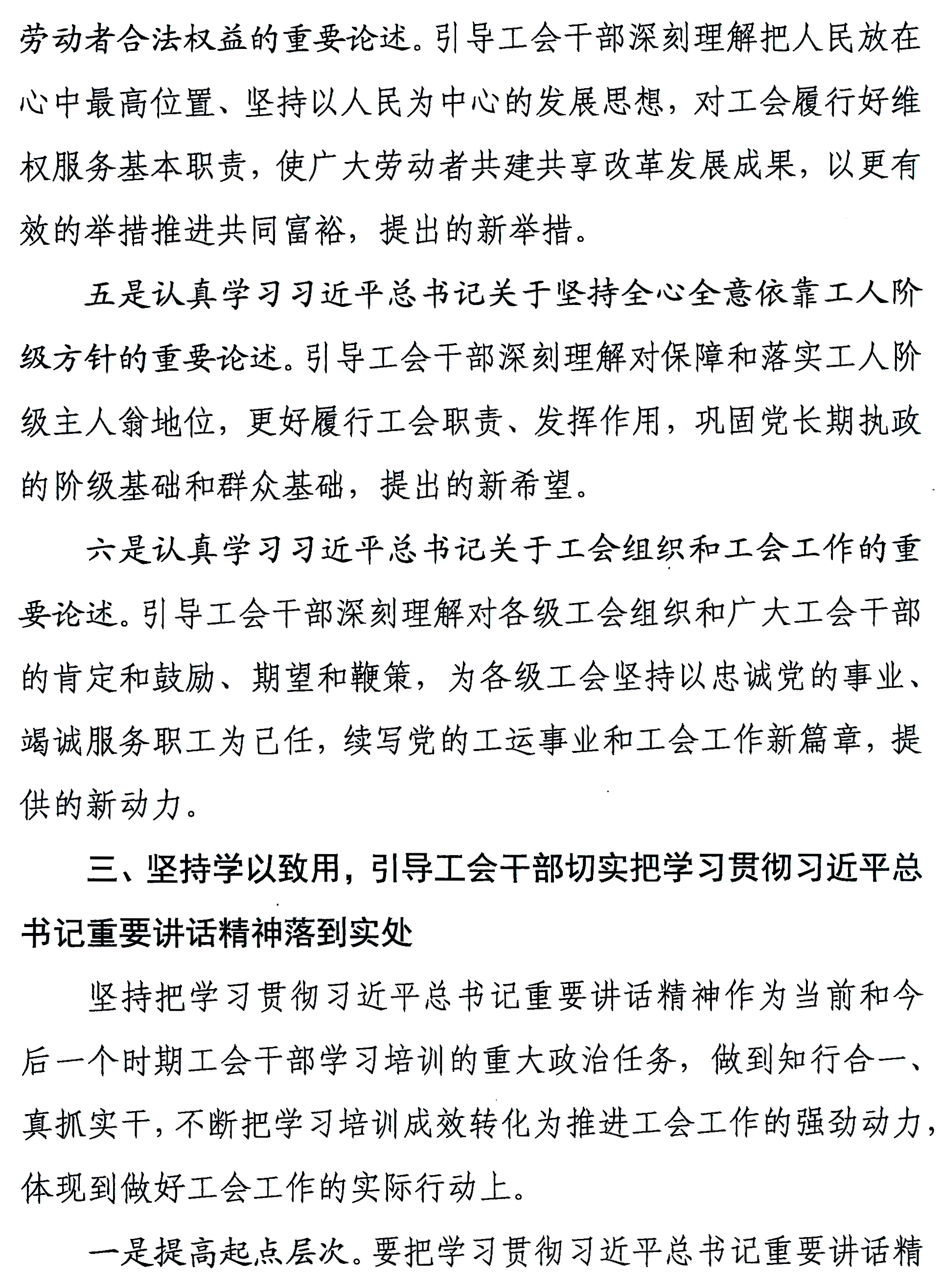 3、确保培训实效。各级工会在培训工作上要做到精心组织实施;在培训内容上要将习近平总书记关于工人阶级和工会工作的重要论述、习近平总书记在全国劳模和先进工作者表彰大会上的重要讲话与党的十九届五中全会精神学习相结合,做到注重全面系统;在培训方式上要与时俱进,不断创新;在培训效果上要做到确保质量实效,最终将学习培训成果转化为推动新时代工运事业和工会工作创新发展的生动实践。