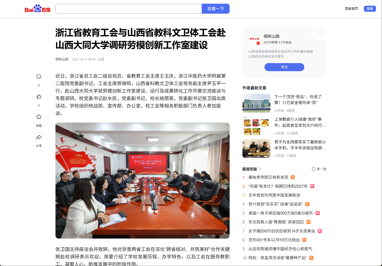 近日,浙江省总工会二级巡视员、省教育工会主席王玉庆,浙江中医药大学附属第二医院党委副书记、工会主席贺晓鸣,山西省科教文卫体工会常务副主席尹玉平一行,赴山西大同大学就劳模创新工作室建设、运行及成果转化工作开展交流座谈与专题调研。校党委书记赵水民,党委副书记、校长姚丽英,党委副书记张卫国出席活动,学校组织统战部、宣传部、办公室、校工会等相关职能部门负责人参加座谈。
